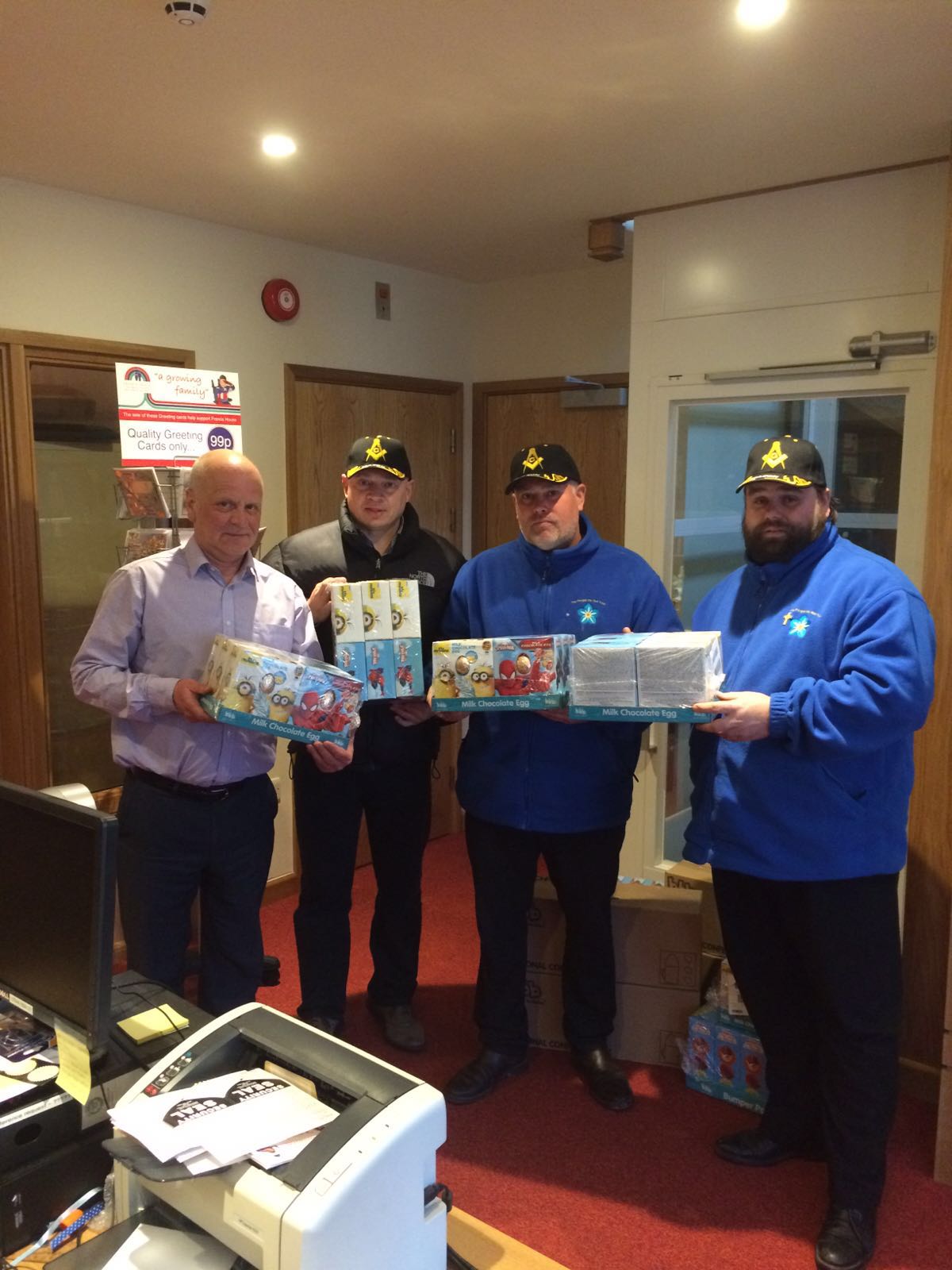Wbro ezra McGowan Bro Nathan mcgowan and wbro Darren Gregory taking a some easter eggs for Francis House donated by the forget me not trust this afternoon